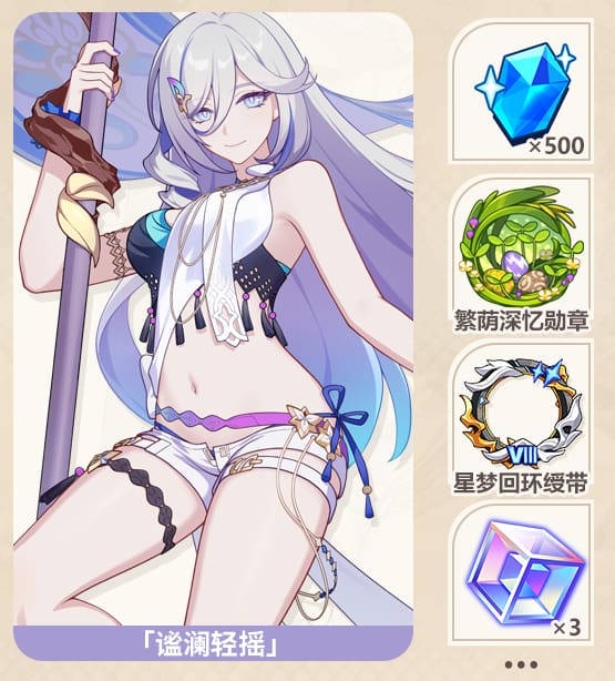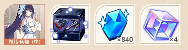 - 5 boîtes de sélection offrant 3 Éclats Honkai, 70 Tores d’Einstein, 200 SC Métal-H2, 70 Décaleurs de phase, 400 Carburants d’éther, 20 Terminaux d’opération ou 200 Stabilisateurs de Wafer.