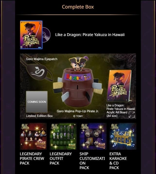 L’édition complète inclut tous ces packs, mais pas seulement ! Elle contiendra en plus un jouet Pop-up de Majima Pirate, le cache-œil de Majima, un tableau acrylique au format A4 de Majima en tenue de pirate, et d’autres bonus pas encore dévoilés.