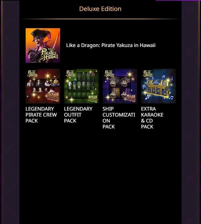 - Pack de customisation pour le navire (inspiré de plusieurs personnages tels que Kazuma Kiryu et Ichiban Kasuga) ;