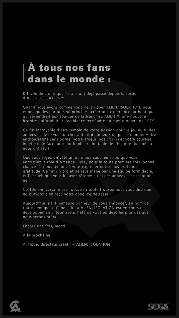 Sorti en octobre 2014, Alien Isolation reste un des jeux survival-horror préféré des fans. Il a d’ailleurs reçu plusieurs dizaines de récompenses. Et c’est donc après dix années de patience, que nous apprenons enfin qu’un Alien Isolation 2 est en cours de développement.