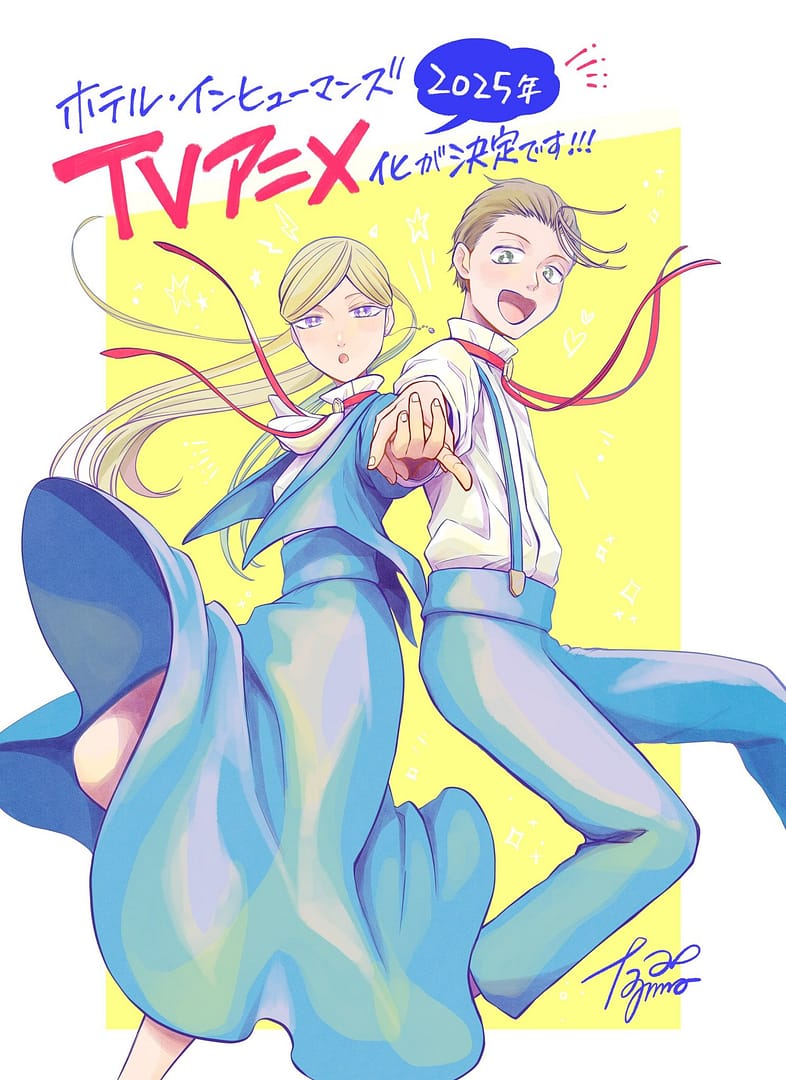 L’auteur du manga, Ao Tajima a laissé un commentaire pour exprimer sa joie suite à cette annonce. Il s’agit pour lui d’un rêve devenu réalité. Il a très hâte de voir ce que le futur réserve à Hotel Inhumans. Et il a aussi vraiment hâte que l’on puisse découvrir l’histoire de Sara et Ikurō. En plus de ce commentaire, il a également réalisé une illustration avec les deux héros :