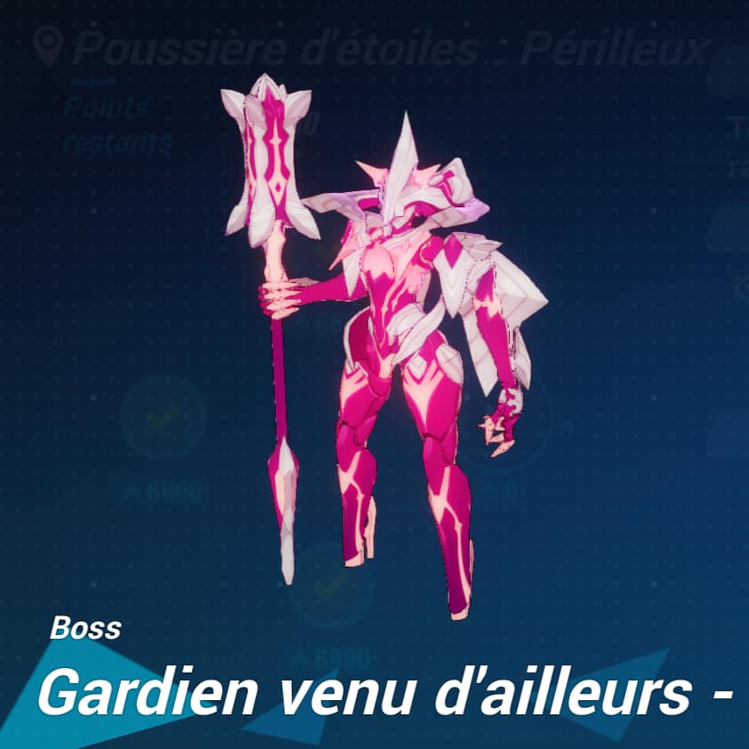 Stratégie : Dans une équipe menée par MECA – Thelema, Plaisir démentiel, nous vous conseillons de vider la première jauge de vie du boss sans activer la compétence d’anneau astral. Et de l’activer aussi tôt que la seconde jauge de vie du boss est remplie, afin de pouvoir l’achever rapidement.