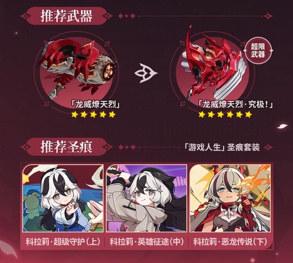 Lorsque Coralie est équipée de son arme recommandée, la compétence d’arme cause plus de dégâts et l’ennemi subit plus de cumuls de brûlure.