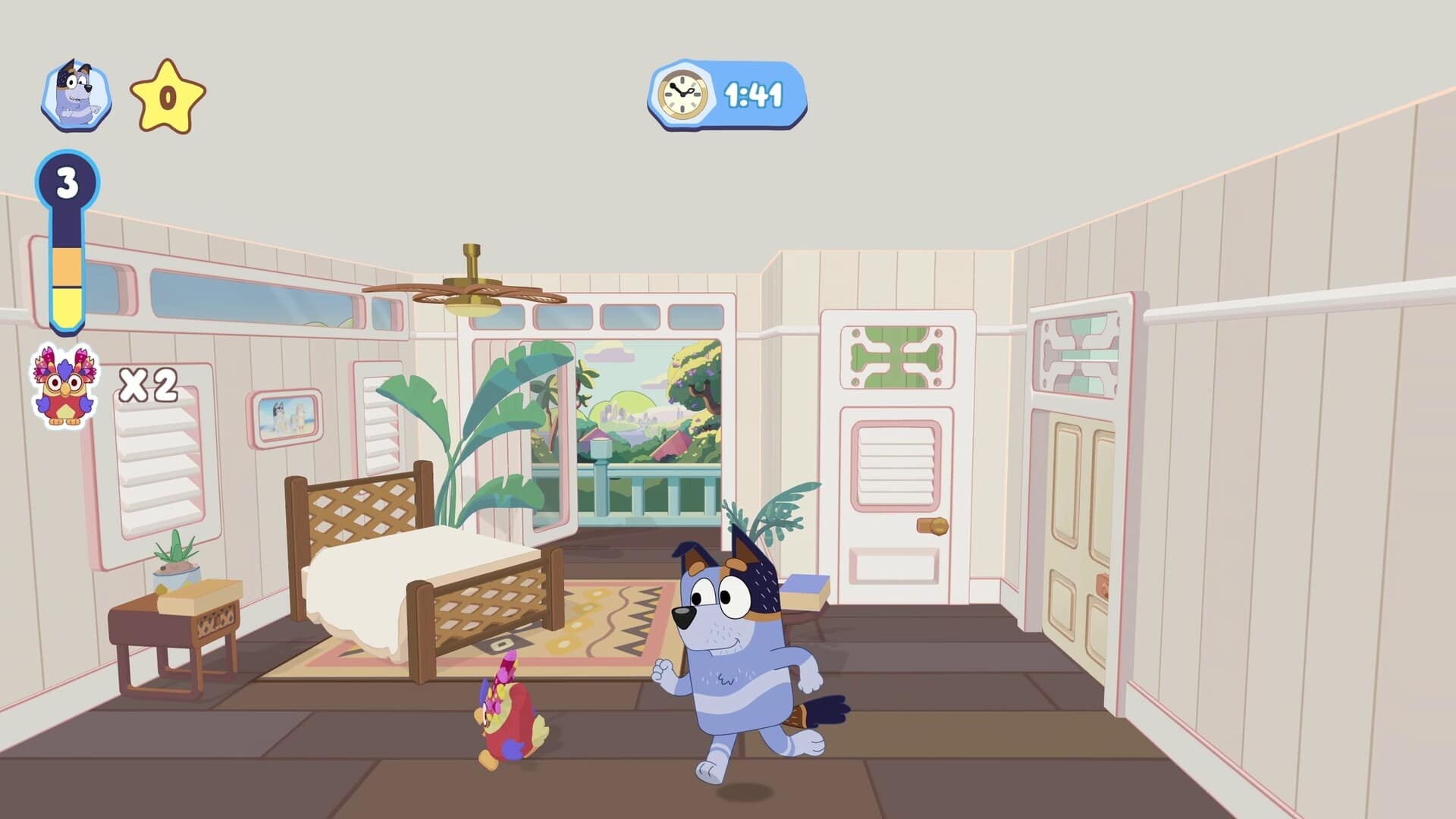 Et ce n’est pas tout ! Ce jeu ne sera pas trifficile, mais très amusant. Profite des merveilles amusantes du monde de Bluey, grâce au multijoueur en local, tu peux jouer avec tes amis et ta famille en mode histoire et en jeu libre ! Explore et collecte des objets pour ton livre d’autocollants, débloque des tenues et découvre les nombreux secrets et références cachés dans chaque lieu. Recrée des scènes emblématiques ou crée tes propres aventures et jeux inspirés de Bluey. »