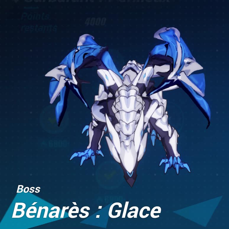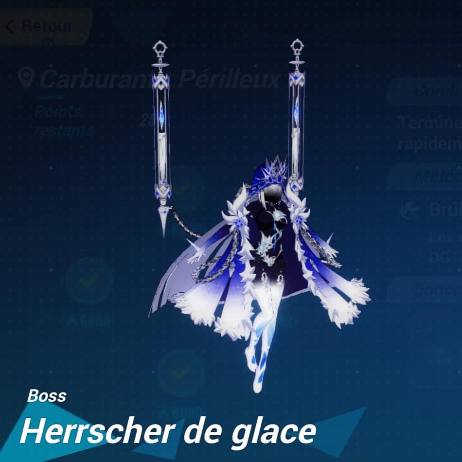 Stratégie : Lors de la première phase du combat, nous vous déconseillons d’utiliser la compétence d’anneau astral. Optez plutôt pour une rotation de personnages. Une fois sa première jauge de santé vide, le boss envoie des vagues de froid tout en attaquant avec des pics de glace. Faites attention de bien esquiver et de passer dans la partie la plus claire de chaque vague. Vous éviterez ainsi l’hypothermie, et vous récupérerez des PC. Lorsque le combat reprend, le boss lance une attaque de zone qu’il faut esquiver. De là, utilisez votre compétence d’anneau astral. Et au besoin, terminez par une rotation de personnages.