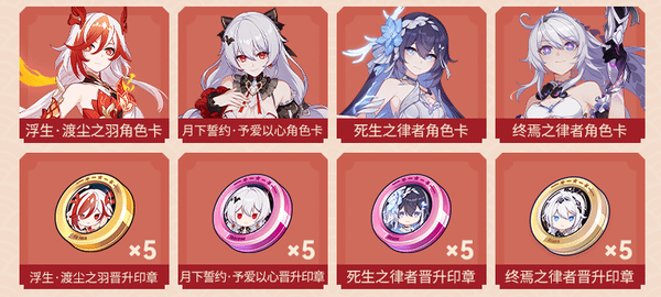 - Des Fragments d’armures de Rang S pour Bronya (IMG – Herrscher de la vérité), Elysia (PSY – Herrscher de l’humanité : ego), Vill-V (QUA – Dispositif de la spirale), Aponia (BIO – Perdition disciplinaire), Durandal (IMG – Palatine de l’équinoxe), etc. ;