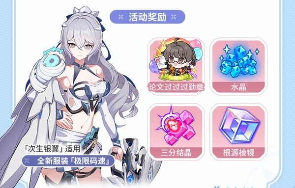 Récompenses principales : Tenue « Extreme Speed » pour Bronya (BIO, Aile d’argent : N-EX), Emblème commémoratif, Cristaux, Éclat Honkai, Prismordiaux